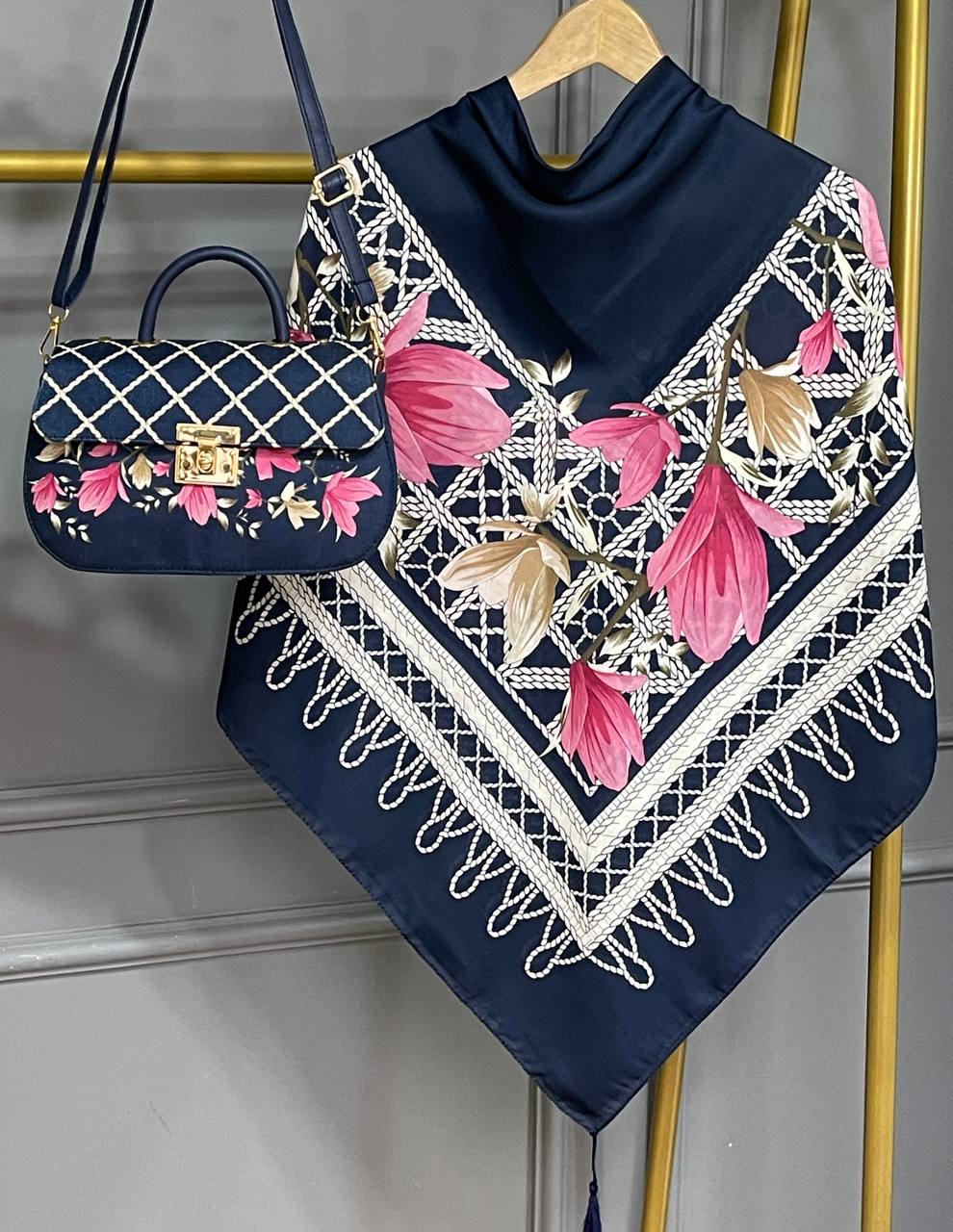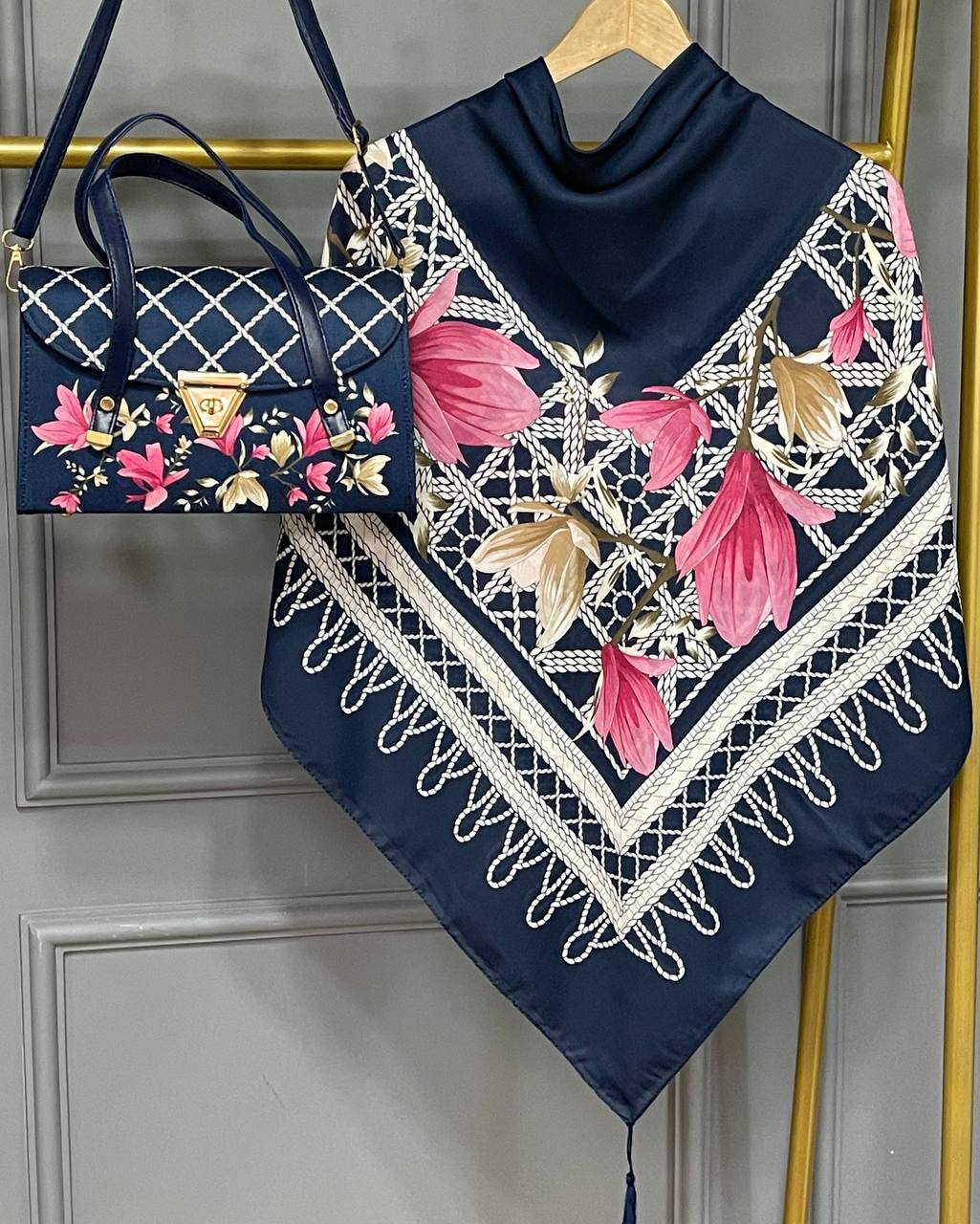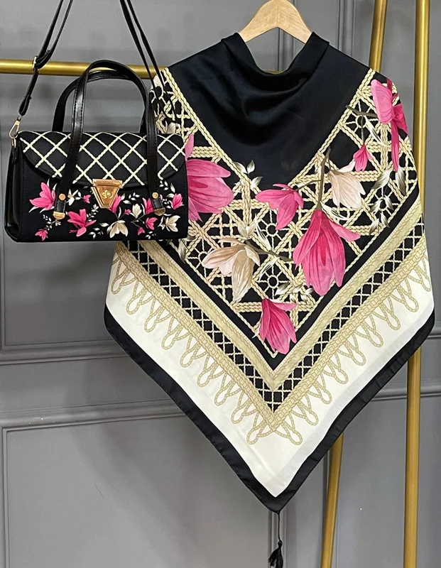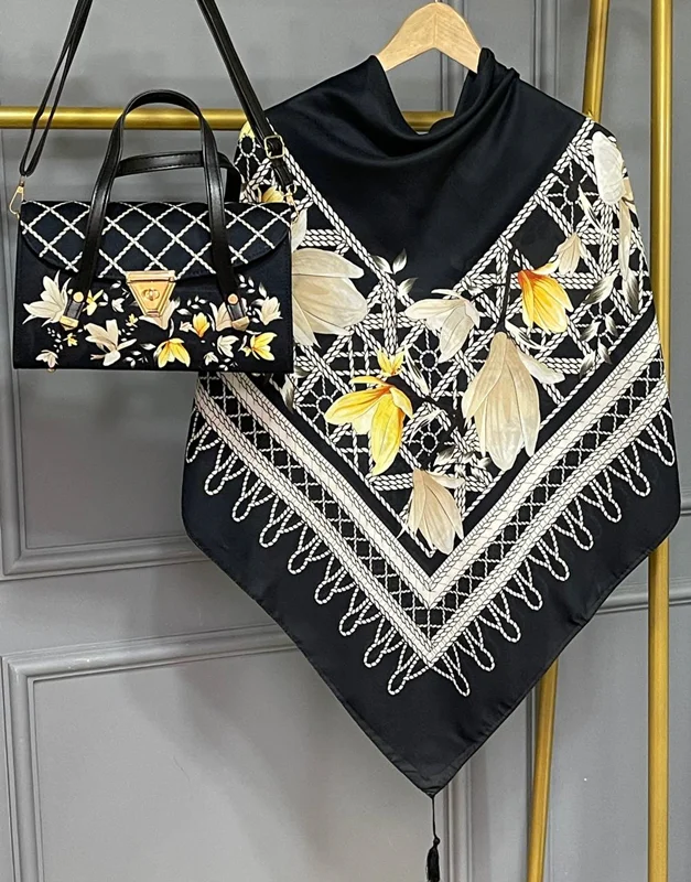 روسری و شال از جنس نخ اسپان سبک و خوشفرم بوده و ایستایی خوبی روی سر دارند. کیف مخمل جیر و چرم در کنار این ترکیب، جلوهای جذاب و کاربردی ایجاد کرده است. این ست برای استفاده روزمره و مهمانی گزینهای مناسب و پرفروش محسوب میشود.