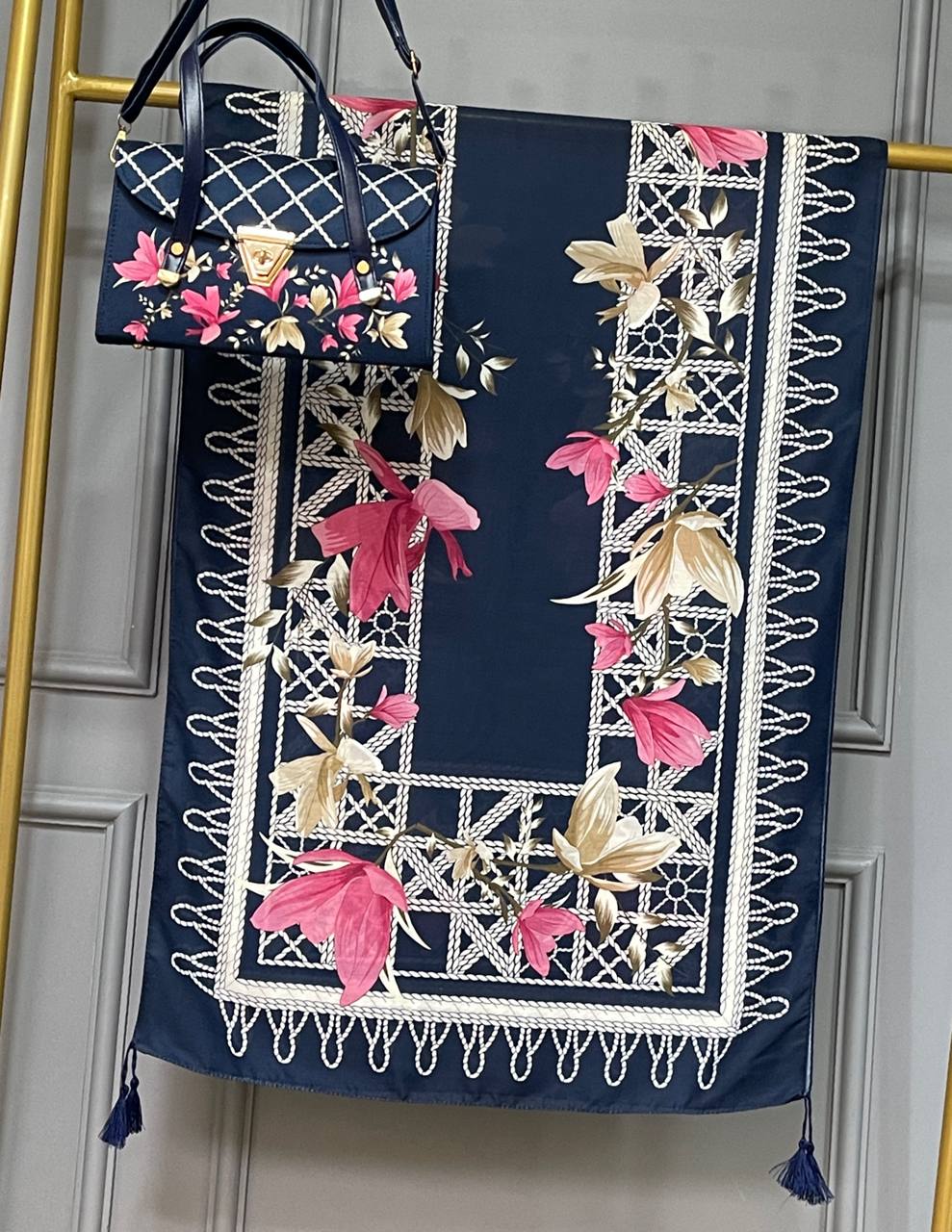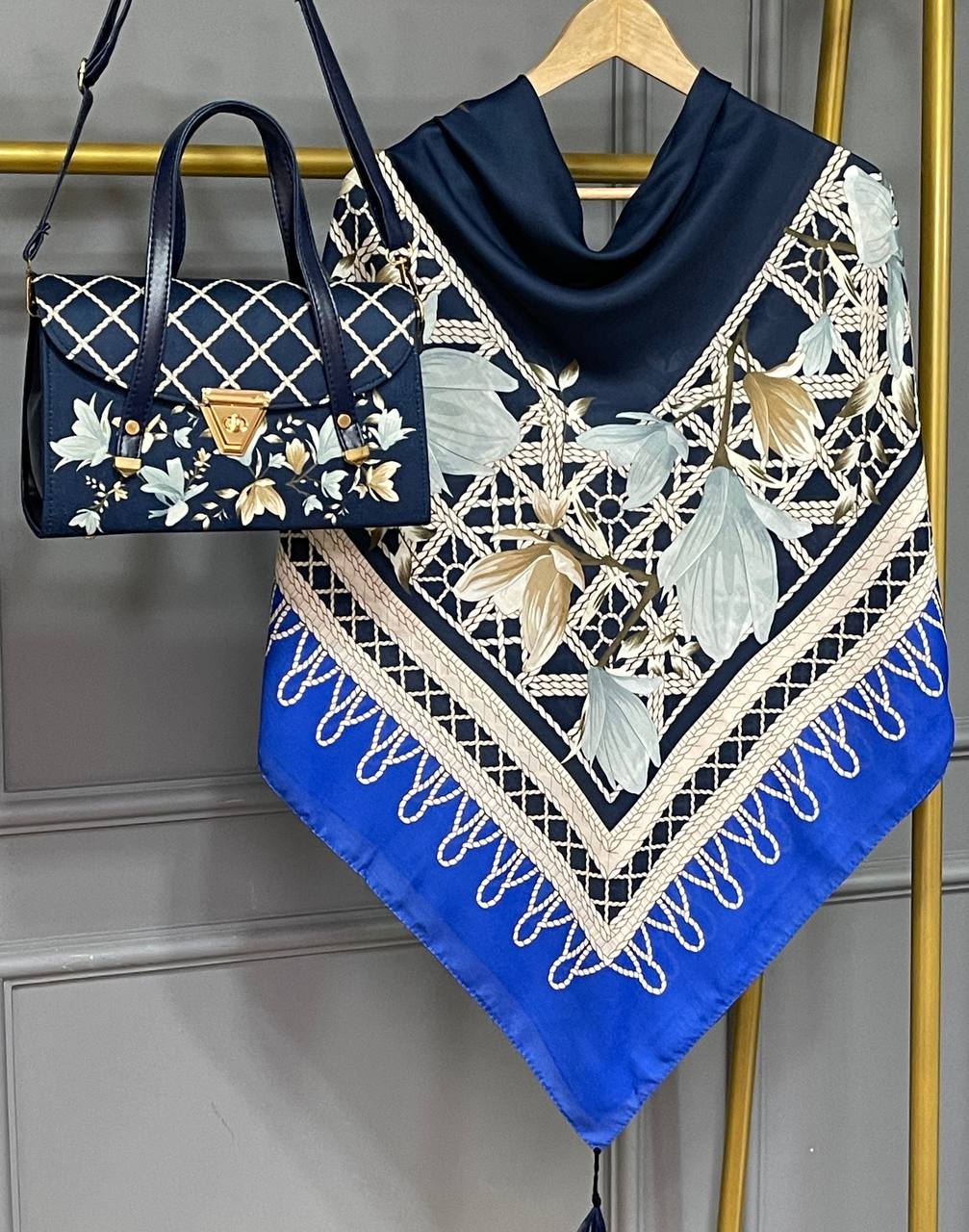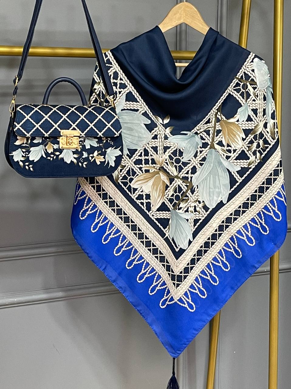 روسری و شال از جنس نخ اسپان سبک و خوشفرم بوده و ایستایی خوبی روی سر دارند. کیف مخمل جیر و چرم در کنار این ترکیب، جلوهای جذاب و کاربردی ایجاد کرده است. این ست برای استفاده روزمره و مهمانی گزینهای مناسب و پرفروش محسوب میشود.
