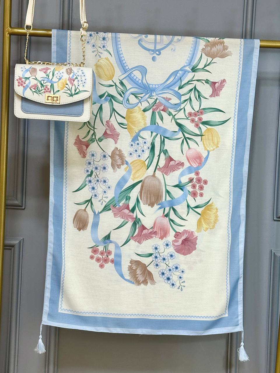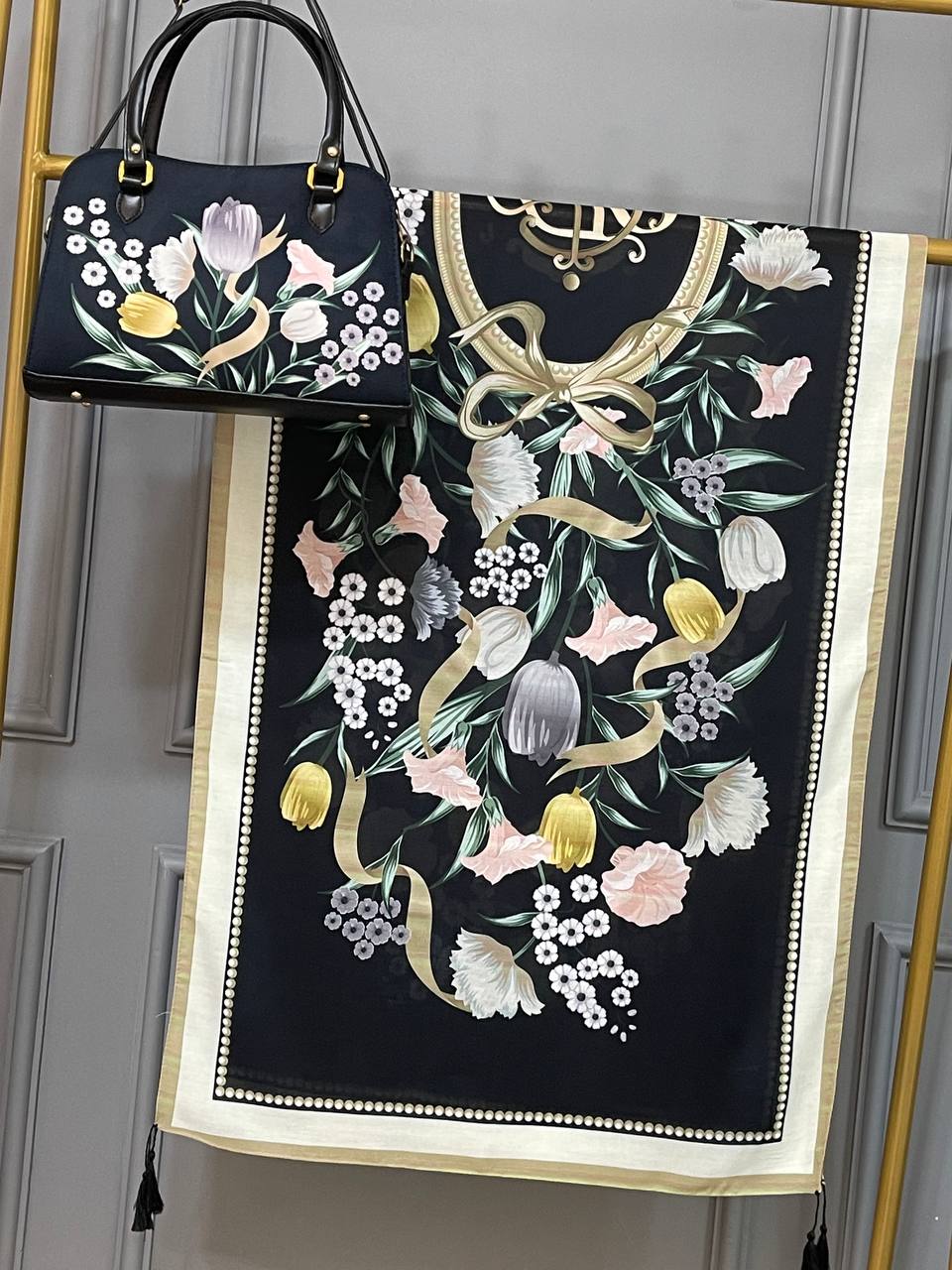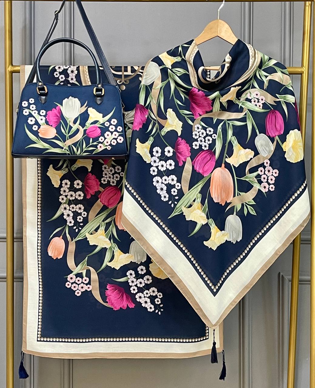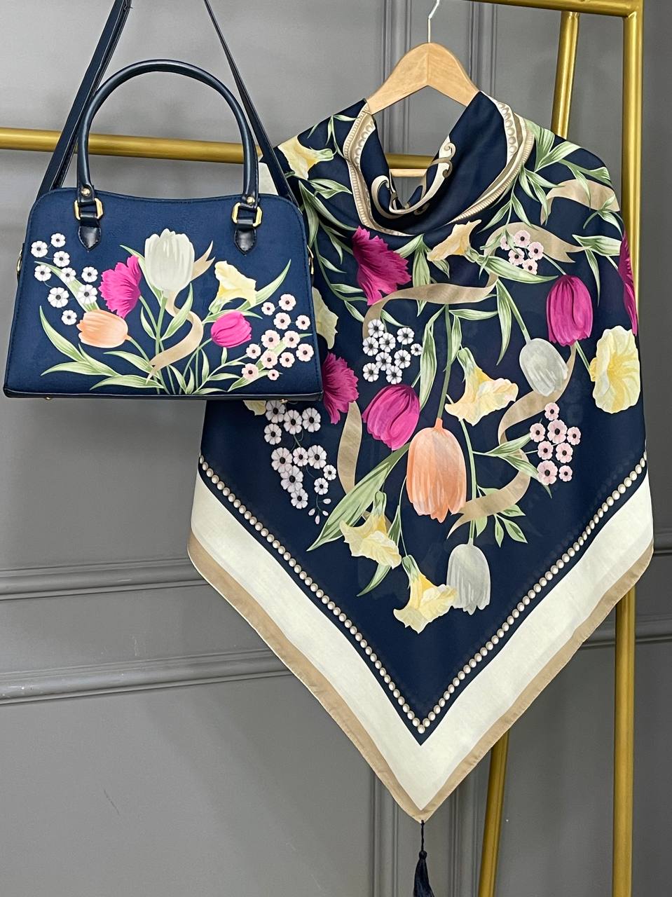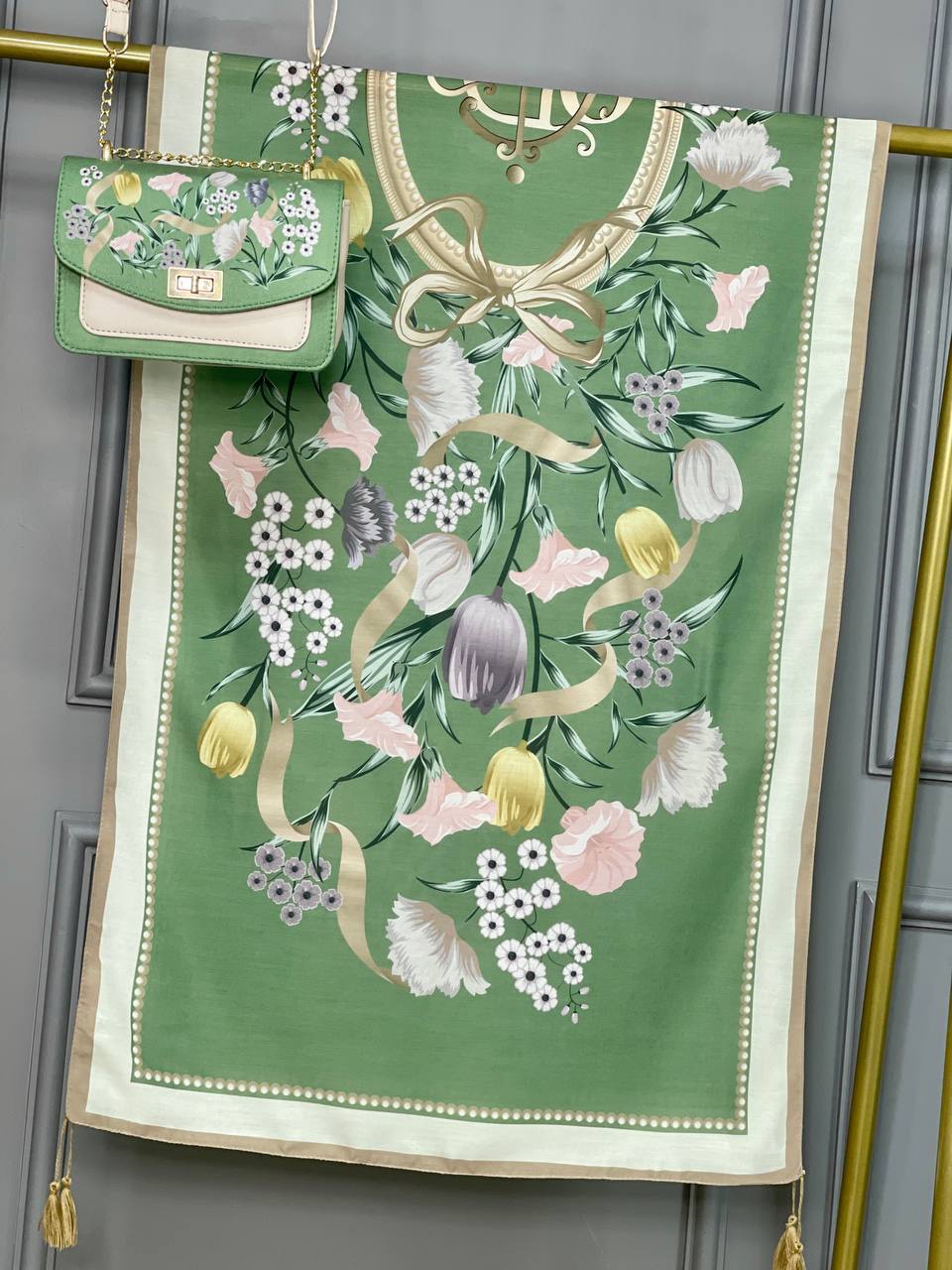 جنس روسری : نخ اسپان شال : نخ اسپان کیف : مخمل جیر و چرم رنگ 5 رنگ ابعاد روسری:130 سانتی متر شال :70*190 سانتی متر کیف B2 :ابعاد 17*22 سانتی متر کیف S1:ابعاد 21*33 سانتی متر دوخت دور چرخدوز طرح دیور