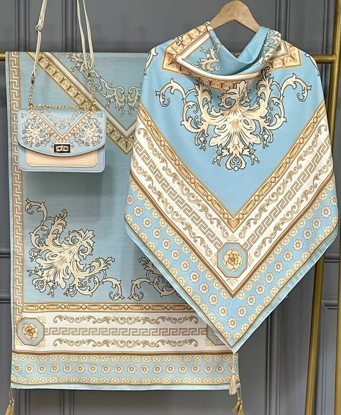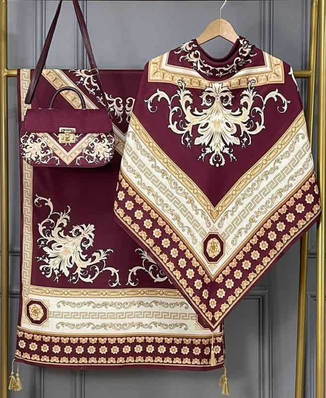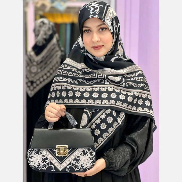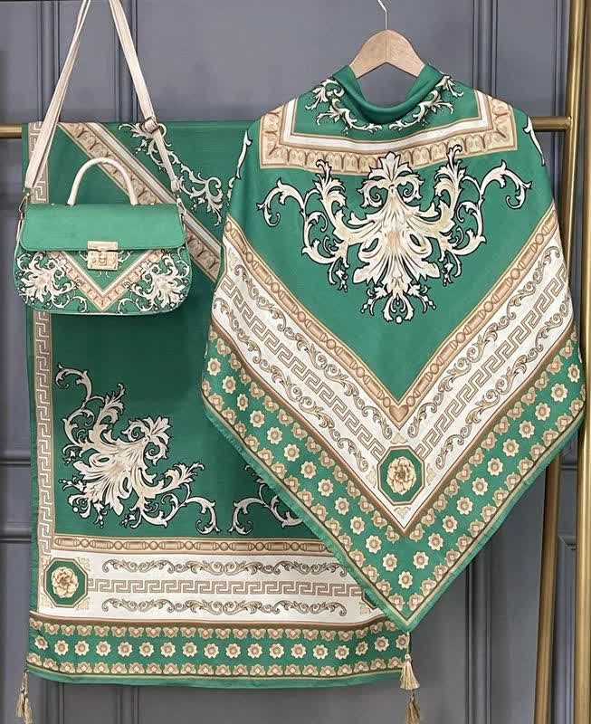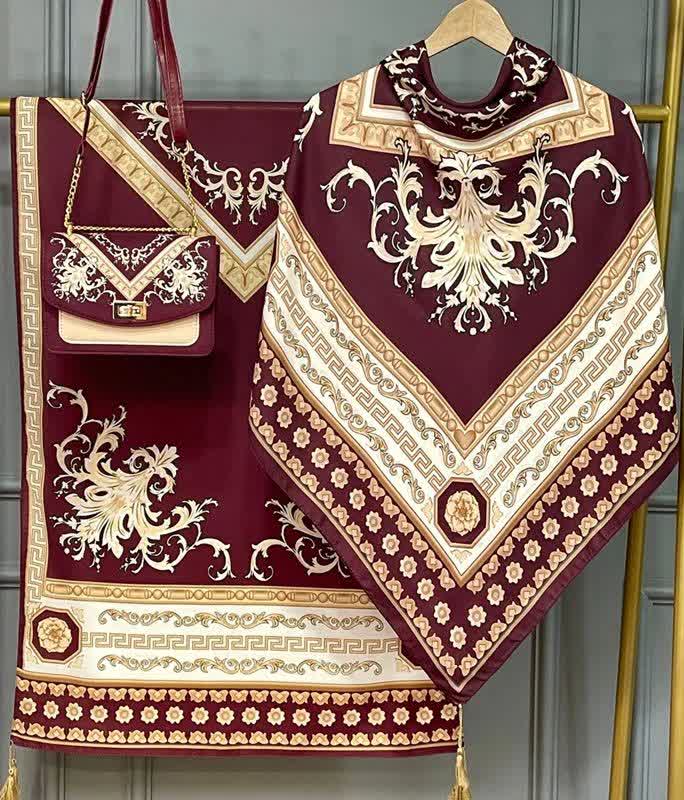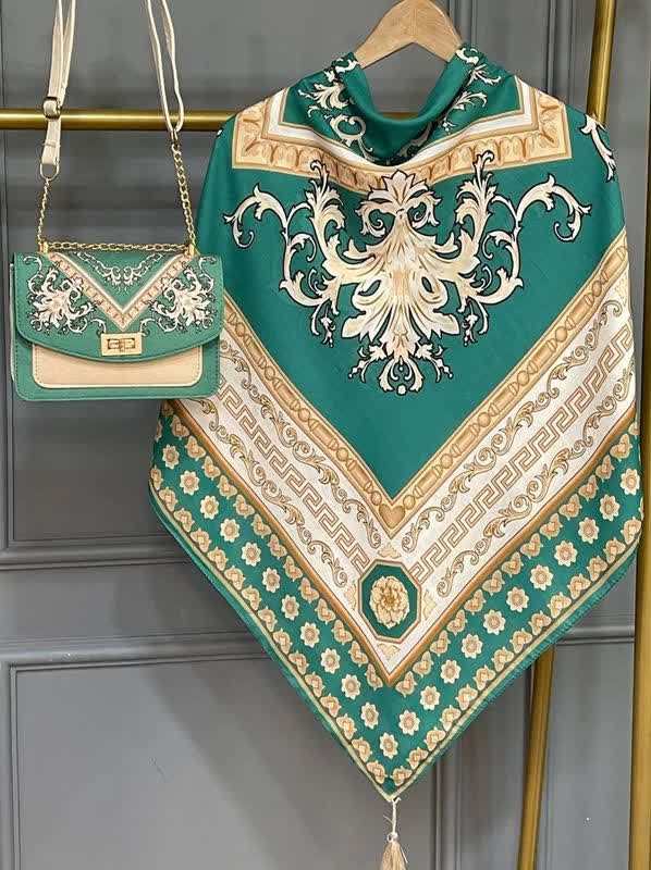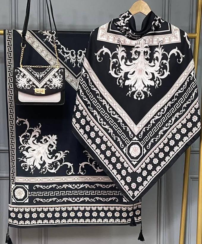 🍷✨ سورنا 👜 جنس کیف: ترکیبی از پارچه مخمل و چرم صنعتی باکیفیت 🎒 دارای بند دوشی 📏 ابعاد کیف: 27×17 cm 🧕 ابعاد روسری: 130 سانت 🧣 ابعاد شال: 190×70 سانت 💎 شیک، خاص و چشمگیر 💰 قیمت با ارسال رایگان: 810 🚚🎁 «روسری سیا اسکارف جنسش نخی اعلاست 🌿 خیلی نرم و راحته، لیز نیست و روی سر خوشفرم میایسته، برای استفاده روزمره هم عالیه 🤍»