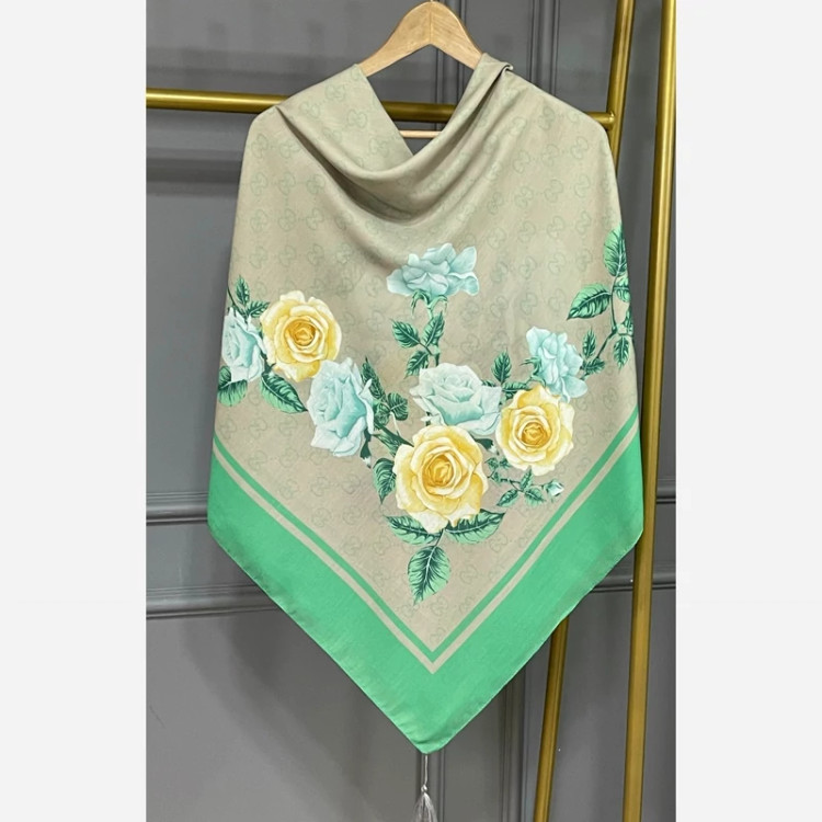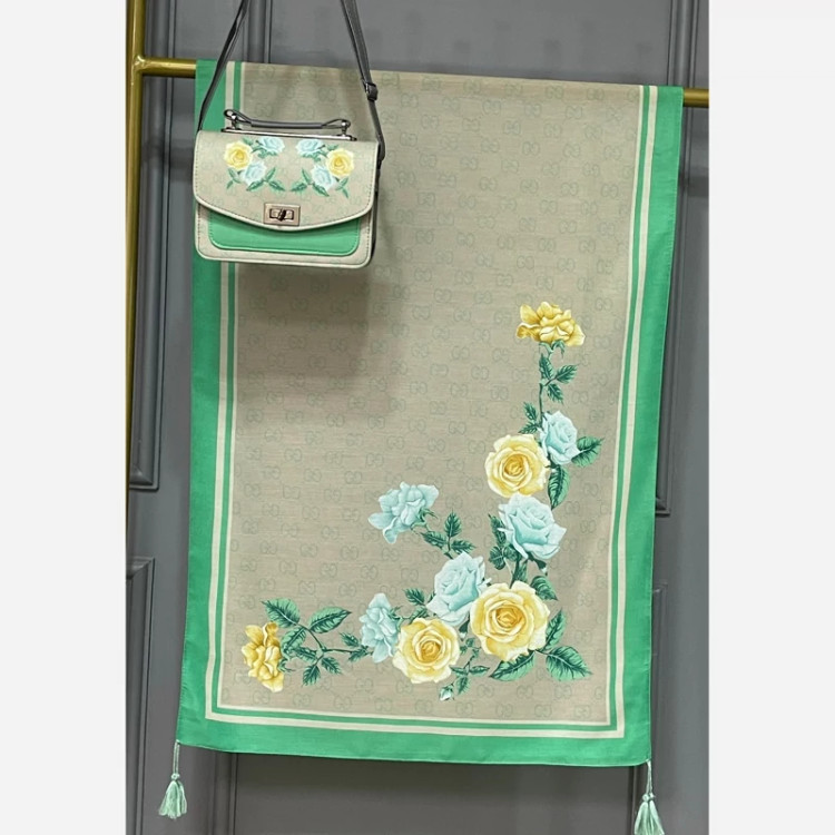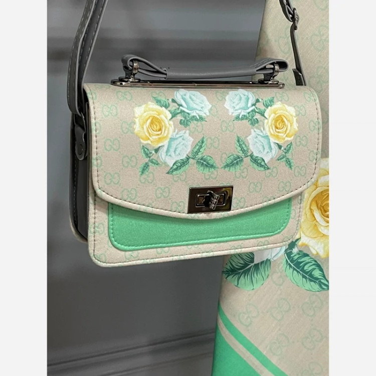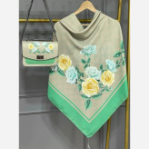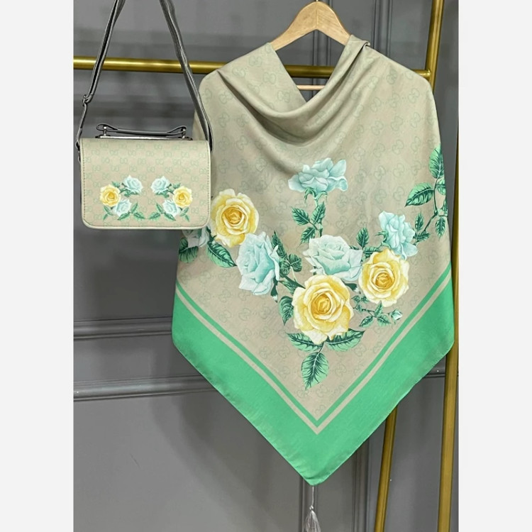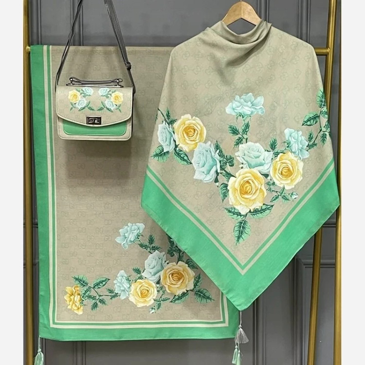 ست کیف و روسری یا شال نخ اسپان مدل رز مغز پسته ای / ارسال رایگان