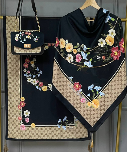 ست گوچی گلی کیف، روسری و شال نخ اسپان با کیف مخمل و چرم صنعتی