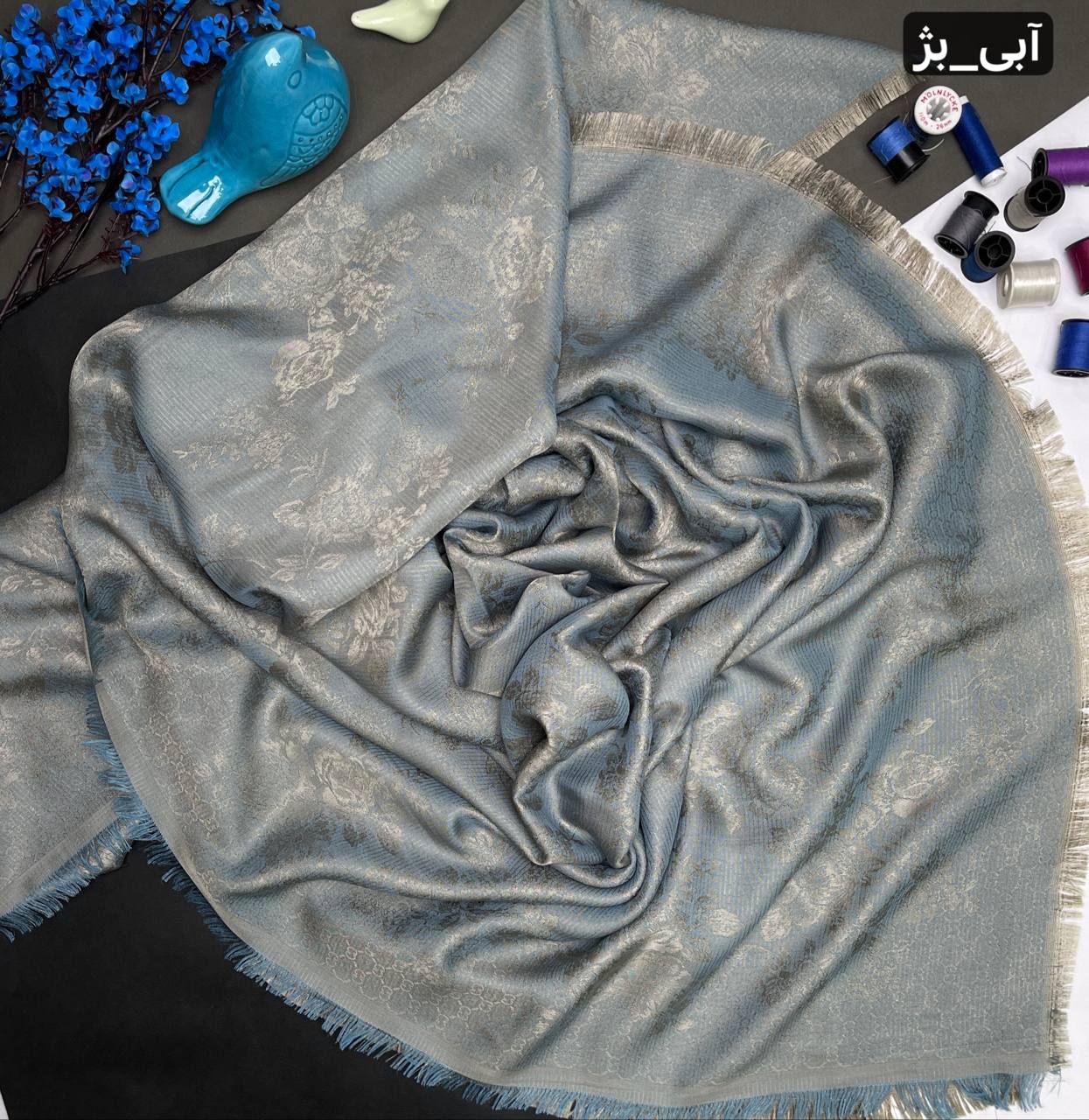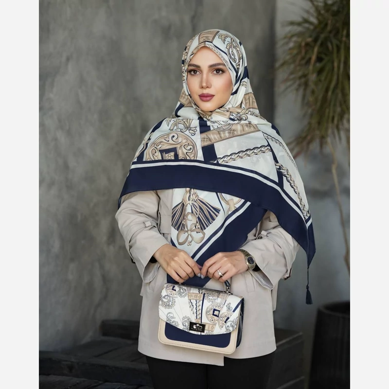 روسری،نخ،ابریشم،ژاکارد،لمه دار،سورمه ای کرم قواره ۱۴۰ ارسال رایگان