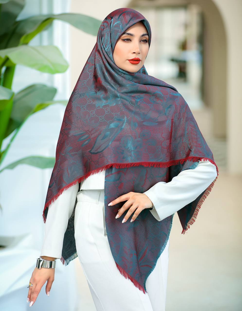 روسری نخ ابریشم ژاکارد طرح اسلیمی لمه دار دورو