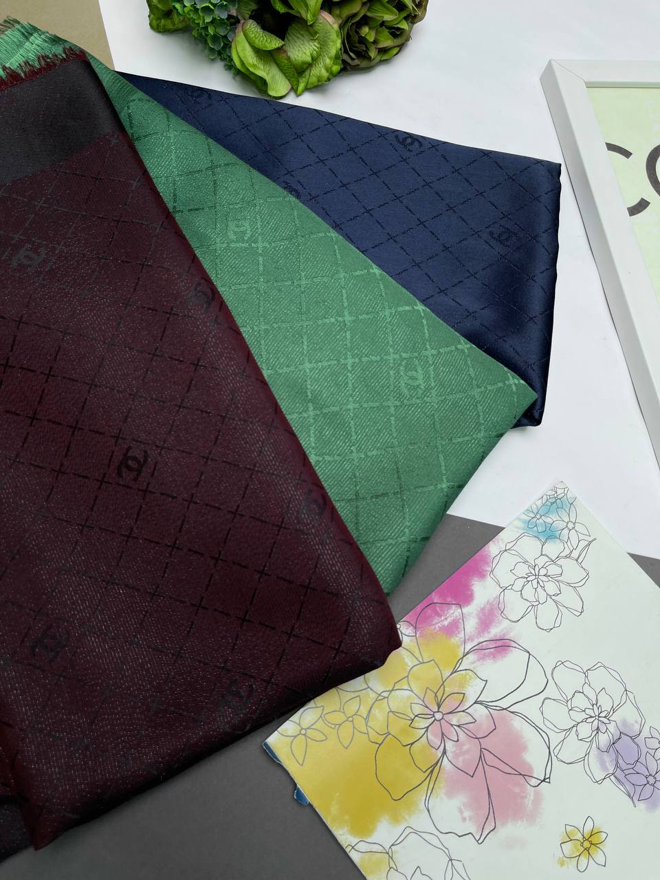 روسری نخ ژاکارد طرح گل شانل ۱۲۰ سانتی ریشه سوزنی ۳ رنگ