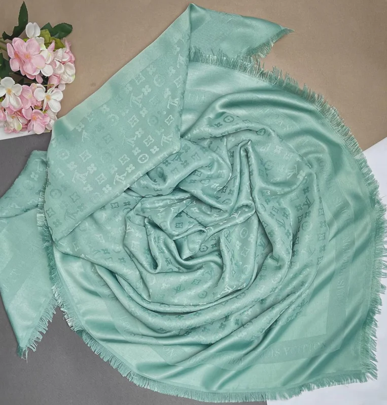 روسری نخ ژاکارد سبز صابونی طرح لویی ویتون ۱۳۵ سانتی ریشه سوزنی