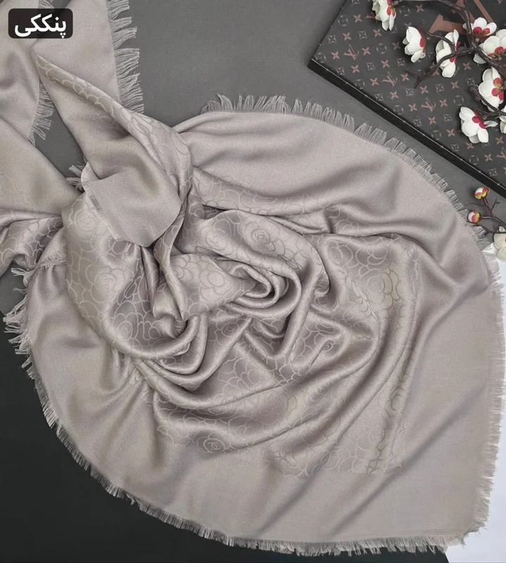 روسری نخ ابریشم ژاکارد طرح گل شانل لمه دار دورو